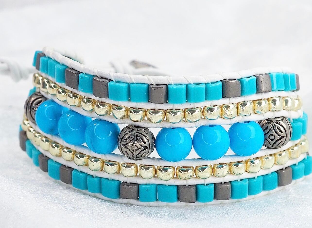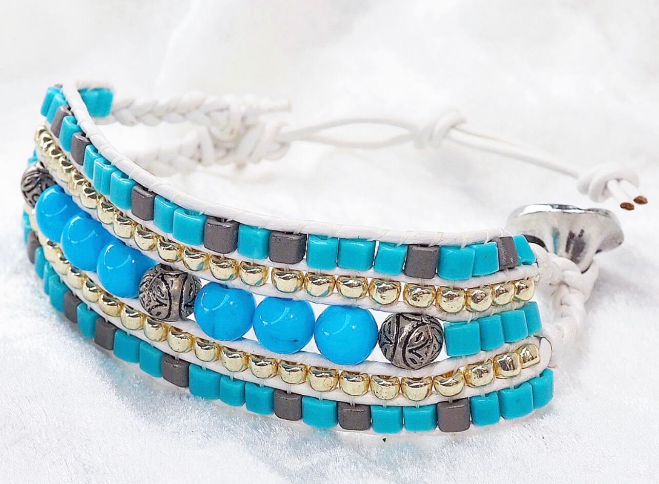 ターコイズとメタルパーツを組み合わせて、合皮で結びました。