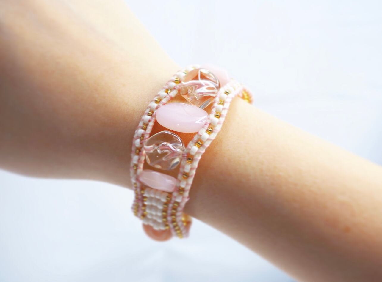 ローズクォーツとビーズを組み合わせて、紐で結びました。