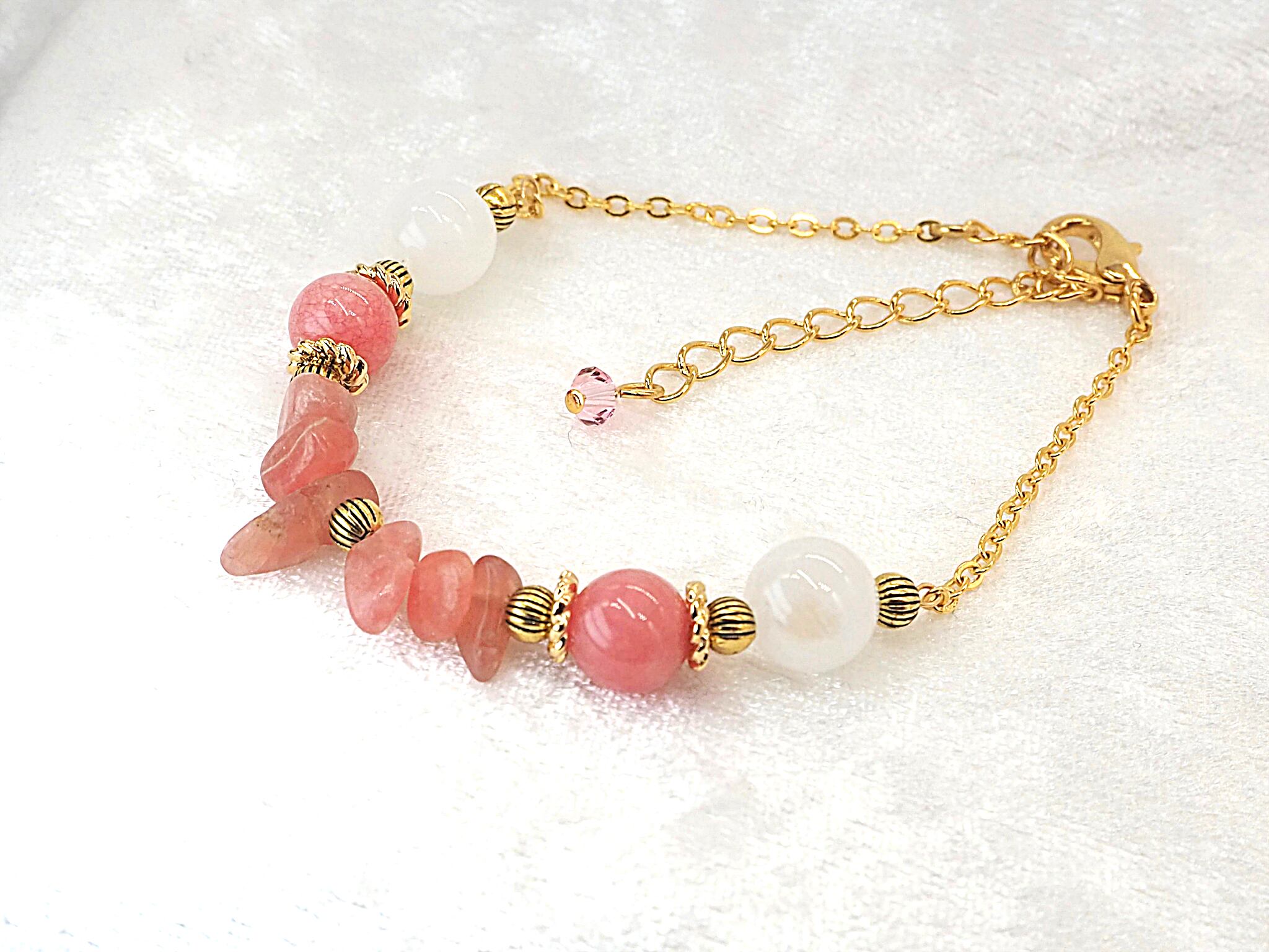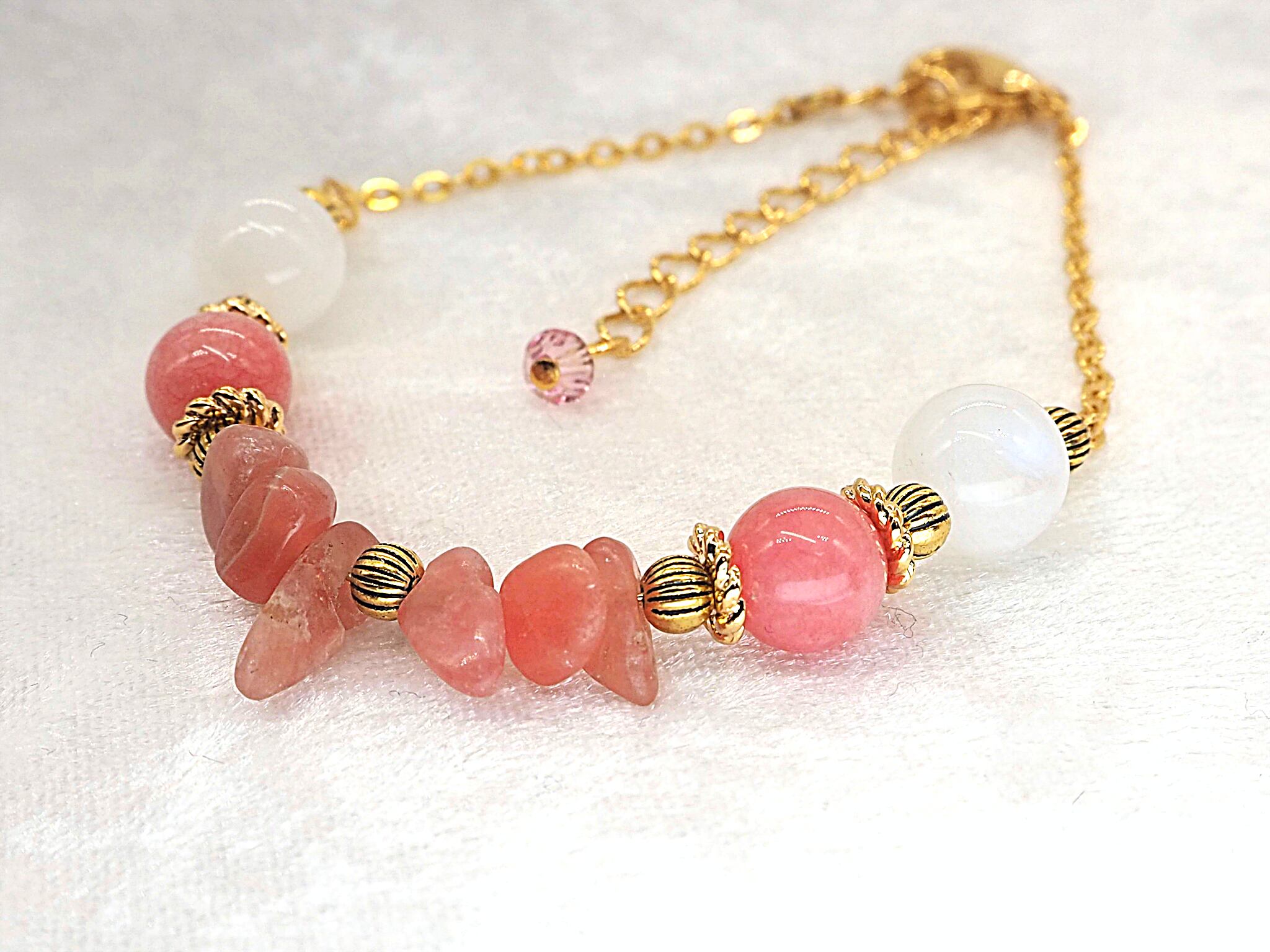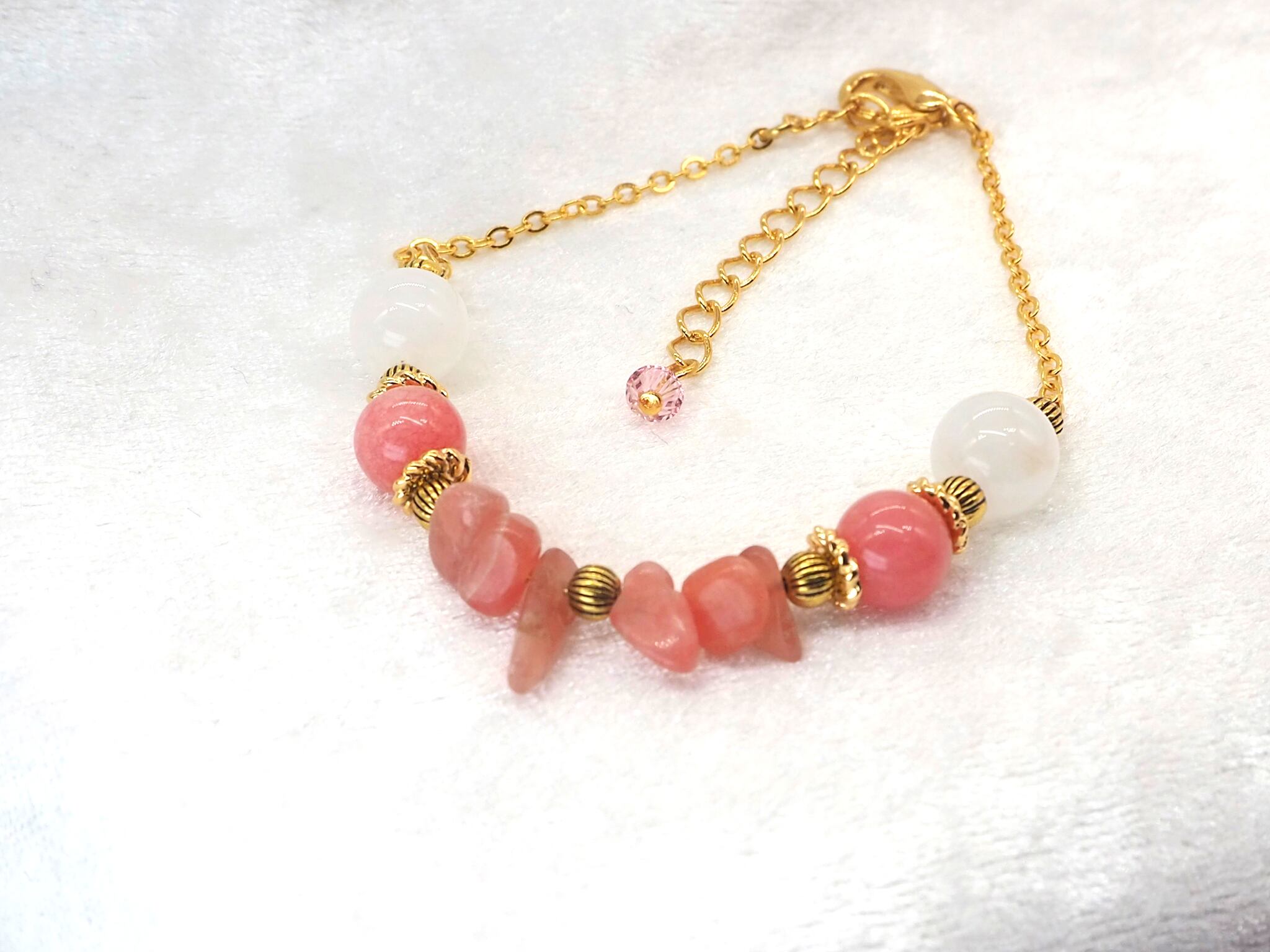 インカローズのさざれ石と同じくインカローズのラウンドカット石、そこにムーンストーンを合わせたブレスレットです。