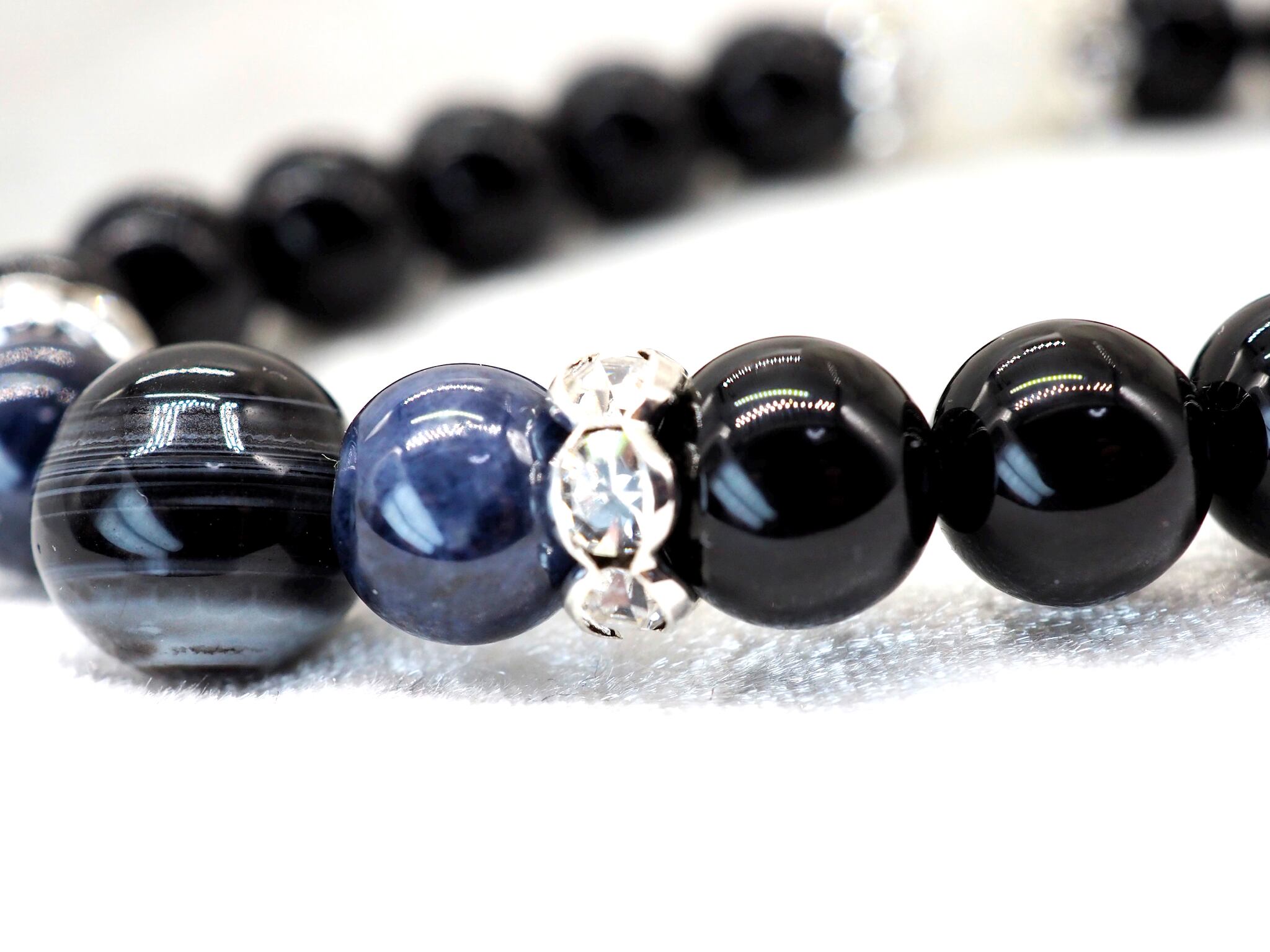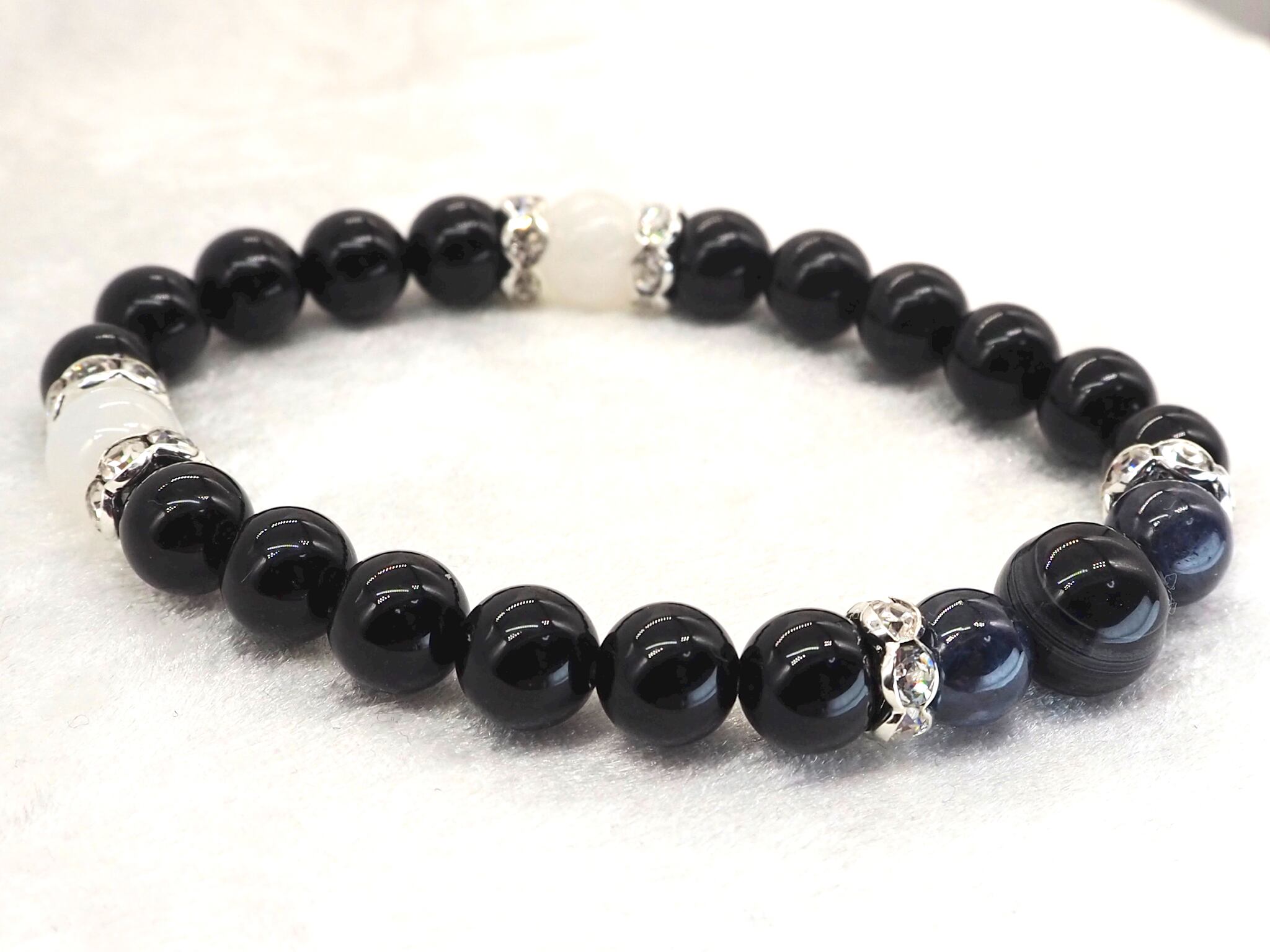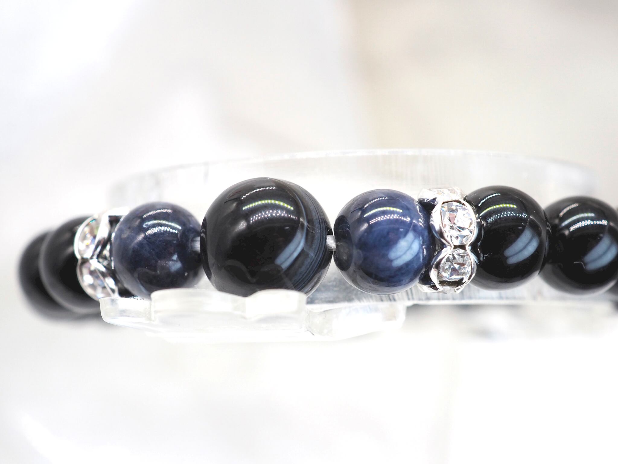 ブラックはオニキス、ネイビーはブルーサファイアを使用してます。ブルーサファイアに挟まれている大きめの石は天眼石を使用してます。