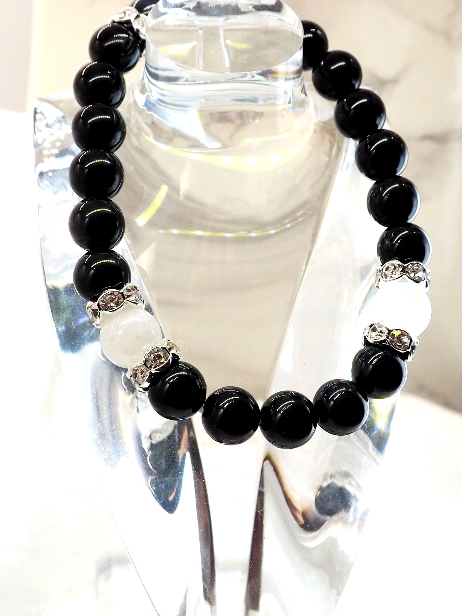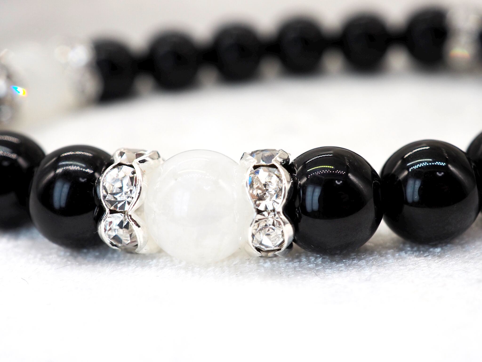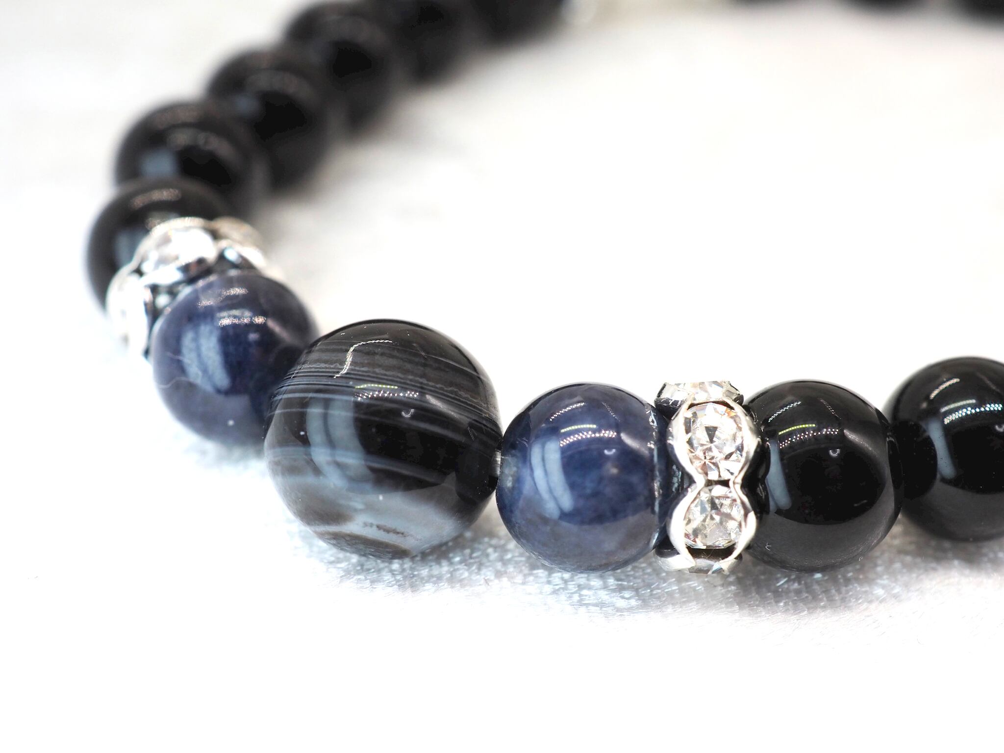 ブラックはオニキス、ネイビーはブルーサファイアを使用してます。ブルーサファイアに挟まれている大きめの石は天眼石を使用してます。